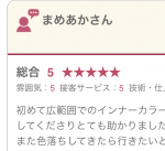 カラーが得意とのことで、初めてこちらを予約しました。翌日、髪を洗ってからも髪の指通りがよく、大満足です。色落ちがどのようになるかわかりませんが、白髪が出てきたらリタッチをまたお願いしたいです。ありがとうございました。