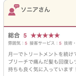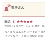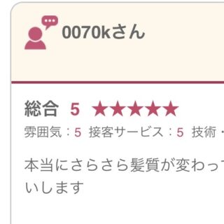 初めて行かせて頂いたのですが とても話しやすくて楽しく過ごすことができました!すごく痛んでいたのでトリートメントをお願いしたのですが 改善された気がします。ありがとうございました!