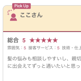 髪の悩みも相談しやすいし、親切で色々安心してお任せできる方に出会えてずっと通いたいと思ってます。