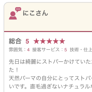 先日は綺麗にストパーかけていただき、ありがとうございました!天然パーマの自分にとってストパーが得意なお店は凄くありがたいです。直毛過ぎないナチュラルな感じにしていただいて朝のセットが楽になりました♪ また、担当のスタイリストさんは聞き上手で...