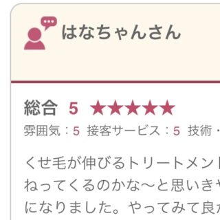 このトリートメント本当にいいです!昔から癖の強い髪質ですがこのトリートメントやりはじめて回を重ねるごとに髪質が良くなってます♪通常よりやや時間はかかりますがその価値はあるかと。トリートメントなので髪の傷みもなく髪のうねりが軽減されて今ではヘ...