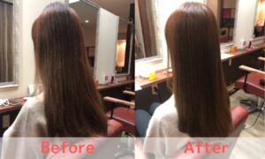 【髪質改善トリートメントカラー】とは、アルカリに傾いた髪の状態を酸性領域のトリートメントをすることで、髪を弱酸性に戻しケアをしながらカラーをしていくことで髪のツヤ感がアップし、しっかりキューティクルを閉じることで、今までよりもカラーの色持ちがよくなるメニューです。今までのトリートメントとの違いは、ケラチンを内部で再構築していくので、持続性や手触りが圧倒的に違います!