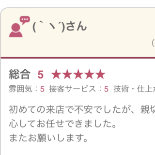 初めての来店で不安でしたが、親切で丁寧に対応してくださり安心してお任せできました。またお願いします。